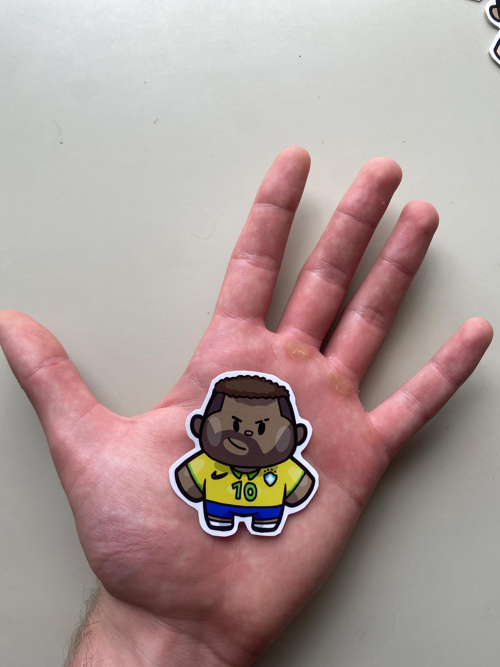 9 Iconic Footballer designs wearing international kit (Cristiano Ronaldo, Lionel Messi, Neymar, Kylian Mbappé, Harry Kane, Lamine Yamal, Erling Haaland, Virgil van Dijk, and Gianluigi Donnarumma) Hand Drawn Digitally and Printed onto glossy sticker paper. Designs are 100% unique and no use of AI. Available to buy single sticker or full set of 9. Approximately 60mm x 60mm. I have put a lot of work into these and really appreciate any purchases. Thanks!